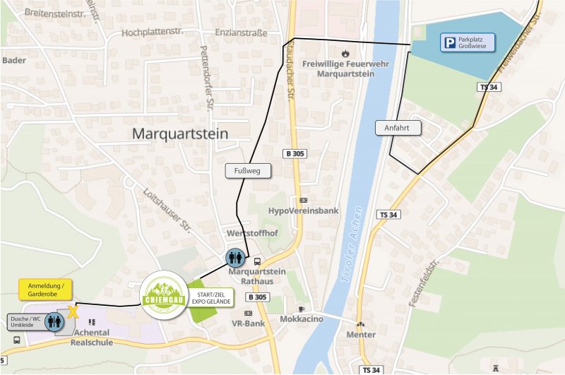 Von der Autobahn A8 kommend die Ausfahrt 109-Grabenstätt Richtung Marquarstein/Reit im Winkl fahren. Der Bundesstraße (St2096) bis zum Kreisverkehr Grassau folgen und die dritte Ausfahrt (Bahnhofstraße) nach Staudach nehmen. Nach etwa 400m abbiegen auf die Marquartsteiner Straße, bis ihr am Sportplatz Marquartstein vorbeikommt (Freiweidacher Straße). Der Straße noch etwa 400m folgen und dann auf den Achenweg abbiegen. Ab hier einfach der Beschilderung bis zum Parkplatz folgen. Ihr könnt euer Auto dort kostenlos parken und seid zu Fuß in etwa 5-10 min am Start/Ziel Bereich am Rathausplatz. (Google Maps Track)